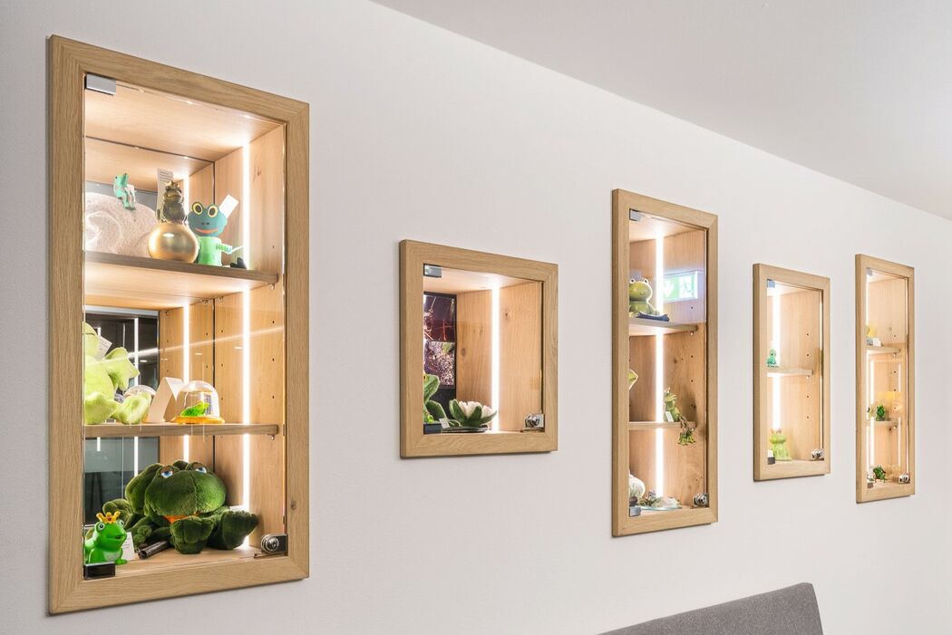 Seither füllte sich das kleine Museum wie von selbst. Zahlreiche Gäste brachten bei ihrer Anreise liebevoll selbst gestaltete Froschi-Kunstwerke mit. Viele der Kinder freuen sich auf ihren Urlaub im „Froschi-Hotel“ und machen sich während ihres Aufenthalts fleißig ans Malen und Basteln von verschiedensten Froschis. Das grüne Tierchen ist bis heute unser Markenzeichen und nicht mehr vom Berghof wegzudenken. Dies ist es auch, was das Froschi-Museum so besonders macht – die schönen Geschichten mit unseren langjährigen Gästen, die dadurch entstanden sind. Bis heute warten viele der Mitbringsel noch auf ihren großen Auftritt, endlich im Froschi-Museum einen Platz zu ergattern.
