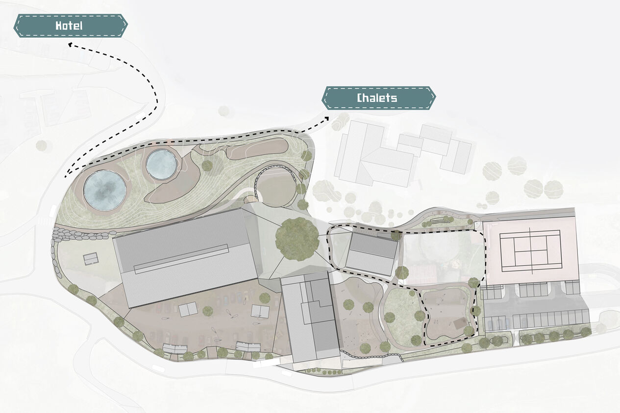 Ein großes Gelände will nachhaltig betrieben werden. Hierfür sorgen 35 Geothermie-Sonden, welche das Hotelgebäude im Winter wärmen und im Sommer kühlen. Die Sonden werden durch die PV-Anlage mit über 300 kW Peak auf den Dächern der neuen Gebäude betrieben.