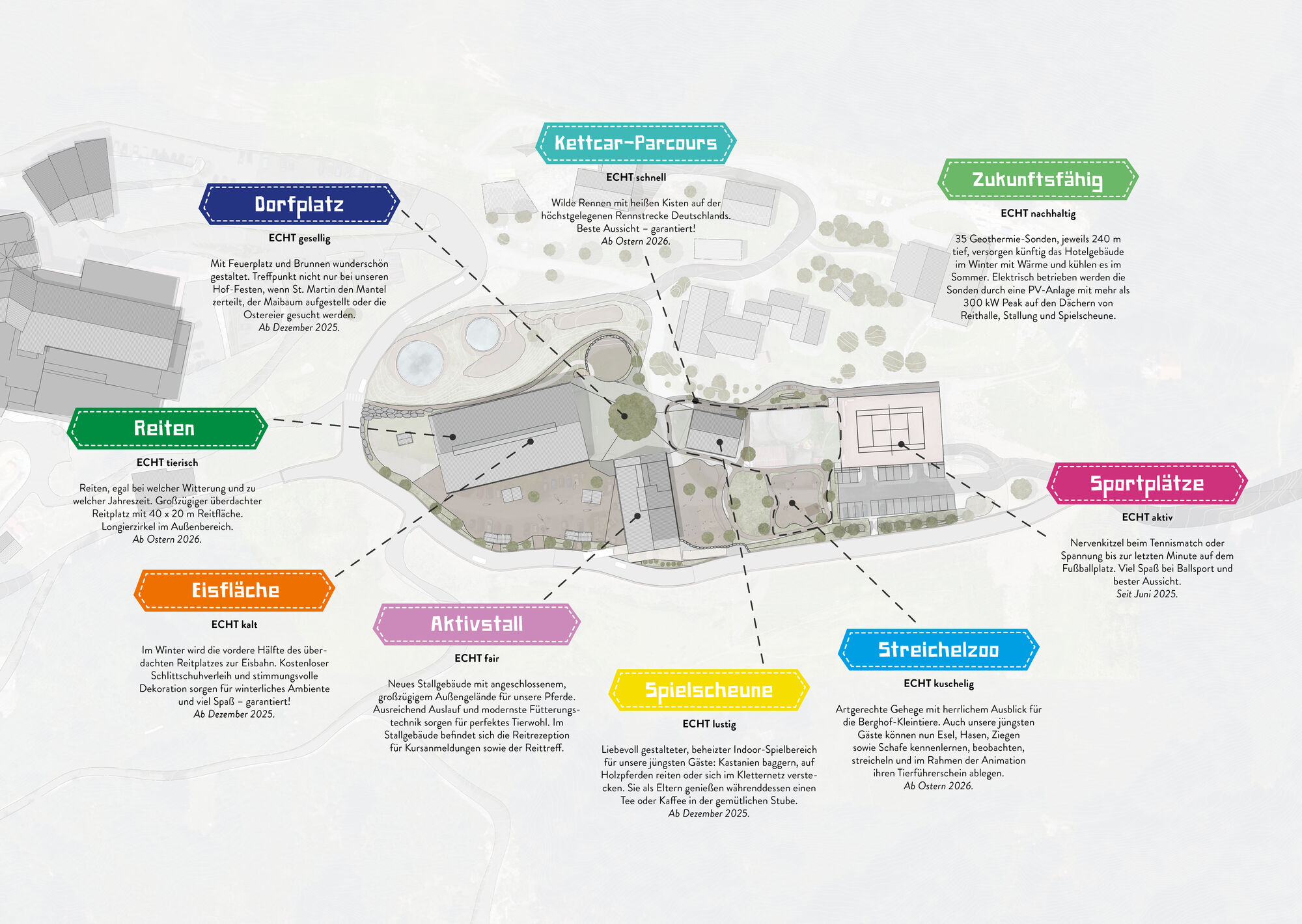 Entdecken Sie bereits jetzt unseren neuen ErlebnisHof! Natur- und tiernahe Aktivitäten für jedes Alter stehen hier im Vordergrund. Freuen Sie sich auf ein erweitertes Reitangebot, eine gemütliche Spielscheune für die Kleinen, ein traumhaftes Gelände für unsere lieben Streicheltiere und vieles mehr. Alle neuen Bereiche finden Sie hier im Überblick!