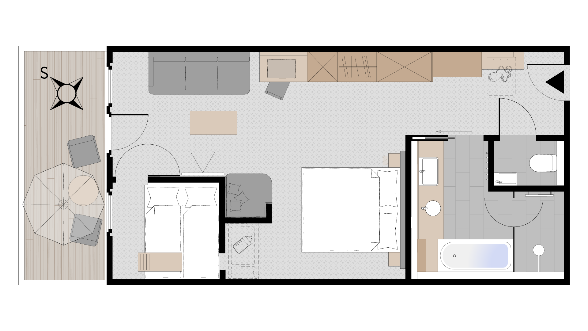 Familiensuite mit gemütlichem Wohn-Schlafraum für die Eltern. Kinderzimmer mit kuscheligem Spielwiesenstockbett. Stillvoll-gemütliche Einrichtung mit viel Sichtholzwänden und Einbaumöbeln aus Esche. Edle Stoffe mit heimeligen Karos.