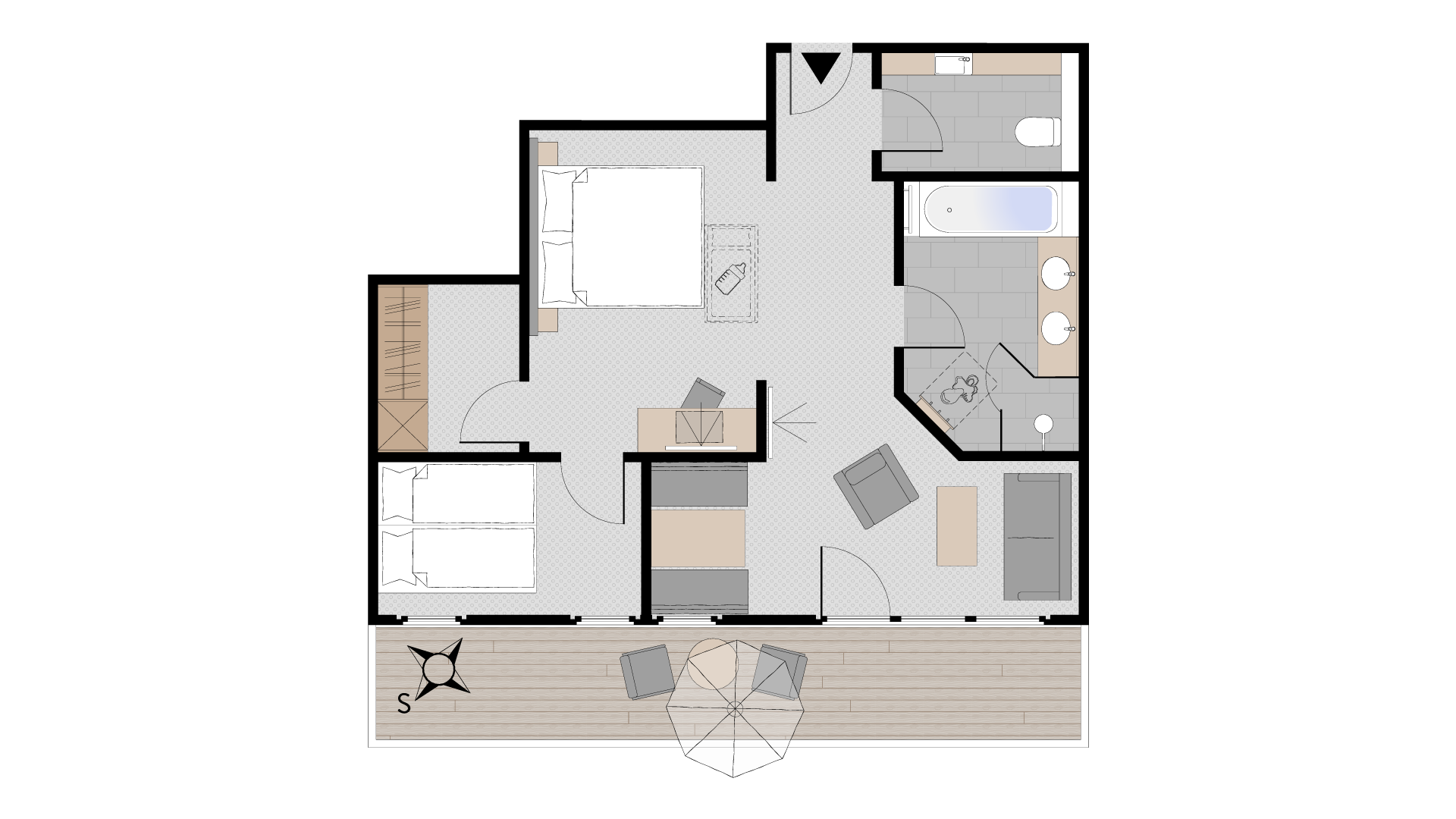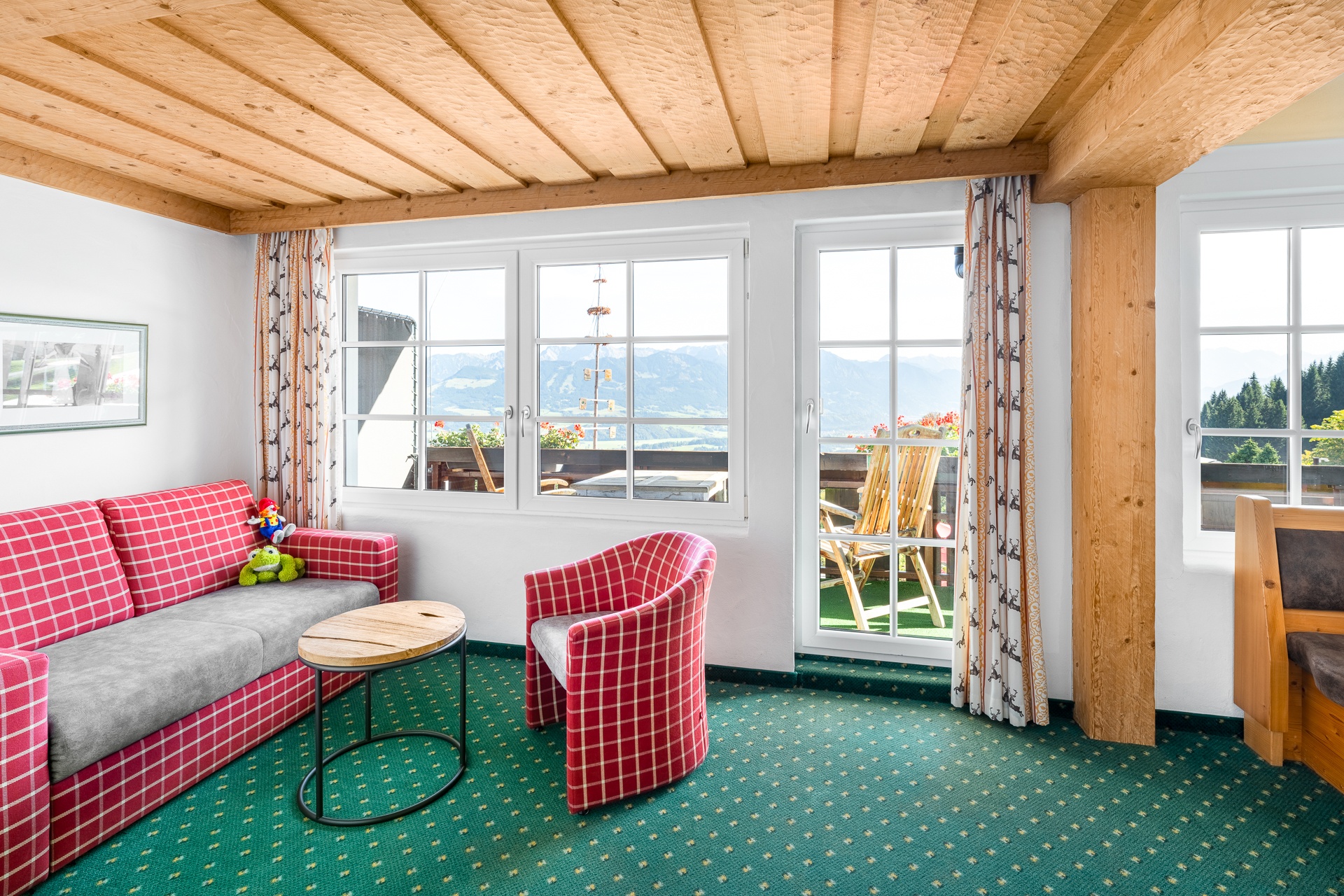 Große Familiensuite mit gemütlichem Wohn-Schlafraum für die Eltern. Kuscheliges Kinderzimmer mit Spielwiesenbett. Eingerichtet mit freundlichen hellen Fichten-Einbaumöbeln.